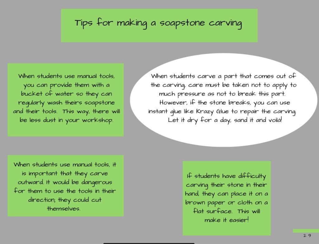 This document was created for Culture teachers introducing soapstone carving with their students. It includes an overview of the tools available and how to use them, as well as a series of tips to facilitate teaching.