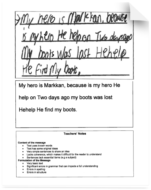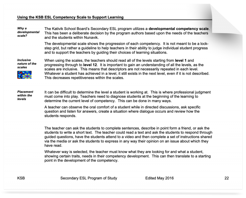 This article is for KI teachers to practice evaluating samples of written texts using the scales of learning development for English as a Second Langue (ESL) competency 3. If you are not familiar with KI ESL program, we suggest you first have a look at the ESL curriculum page. To properly evaluate your students’ progress, you must understand the scales, especially because as students progress from one level to another, the scales overlap in subtle ways. Here is your chance to practice using them!