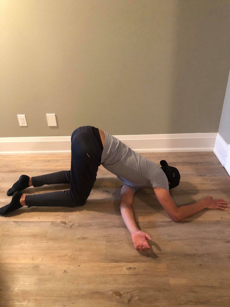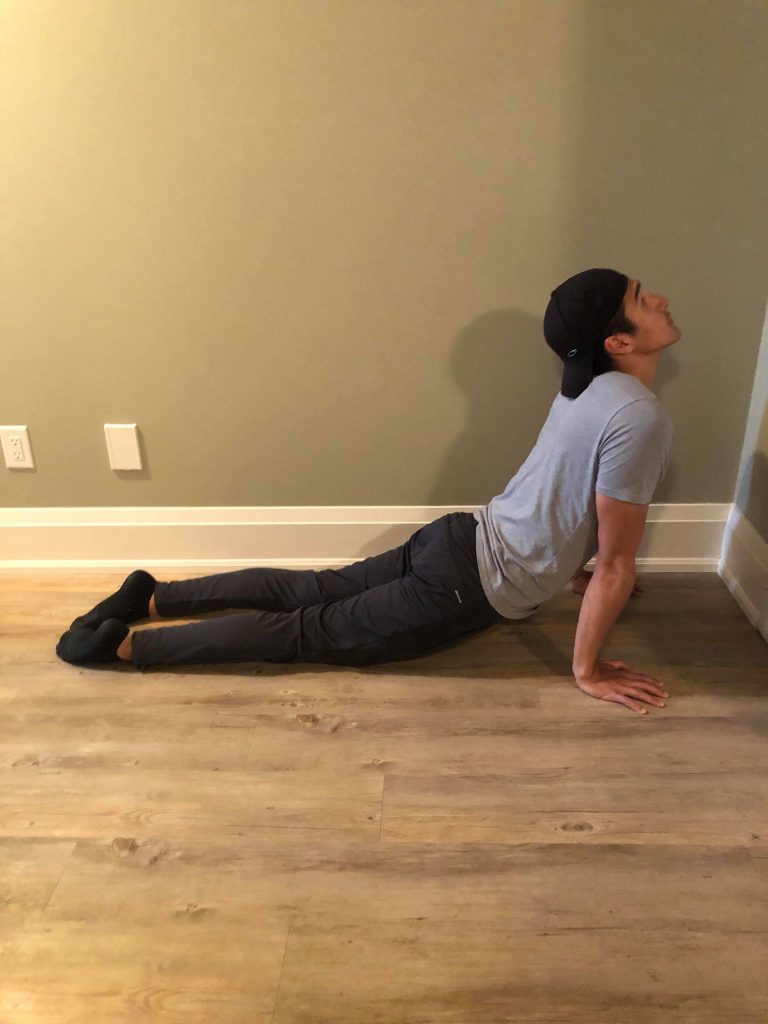 • Lie facedown (prone position) on the floor, with hands on the floor beside shoulders.