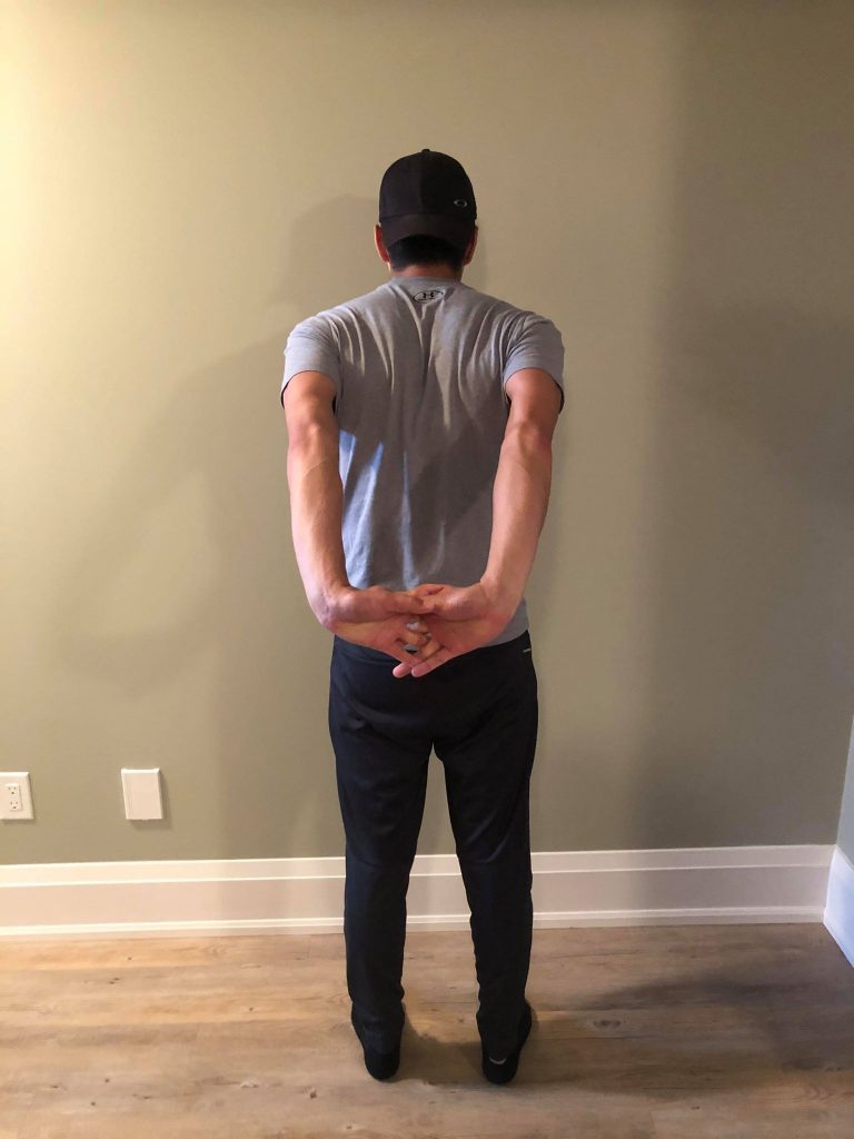 • Clasp your hands directly behind your back, palms touching.
