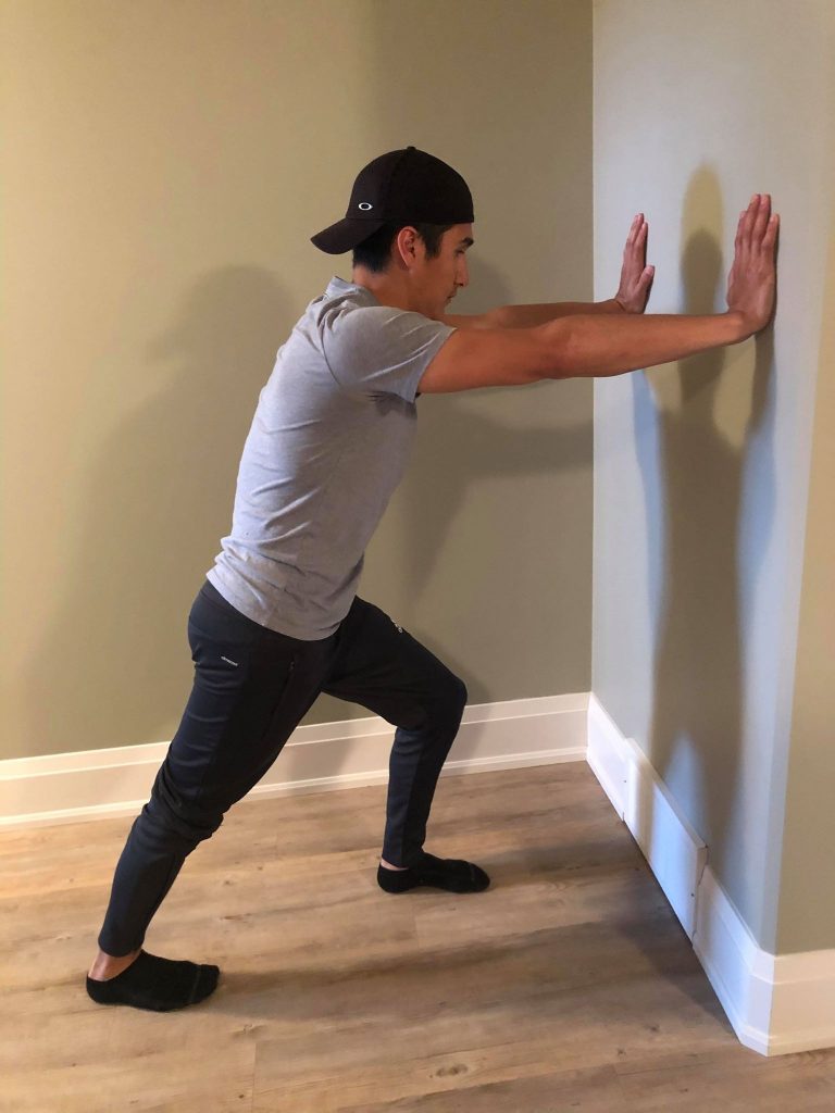 • Lean toward the wall with both feet planted on the ground.