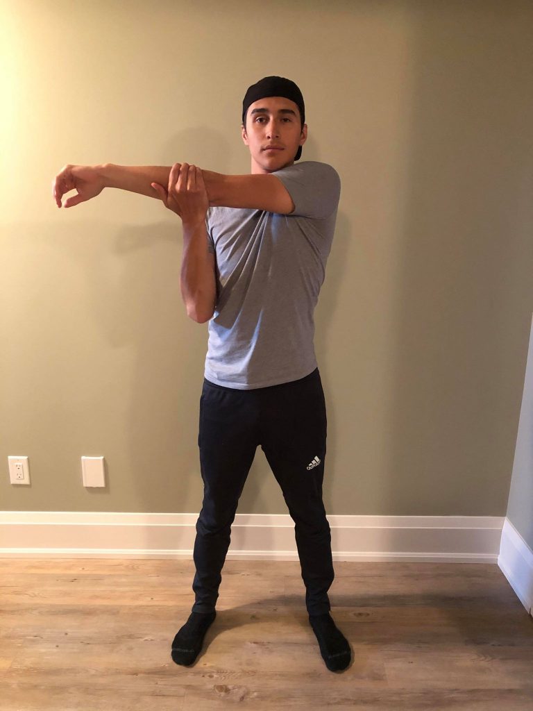 • Use your right hand and gently press your left arm closer to your chest.