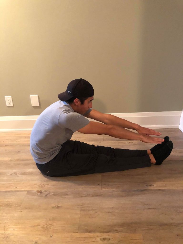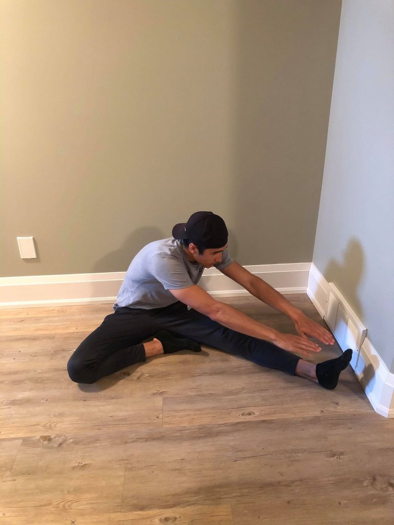 • Try to keep the stretched leg as extended and flat on the ground as possible, with your toes pointing up. Slightly bent the stretched leg if needed.