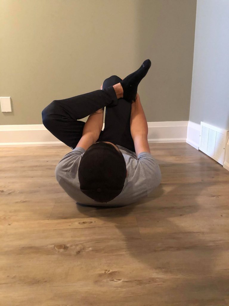 • Pull your right leg closer to your body to deepen the stretch in your left leg.