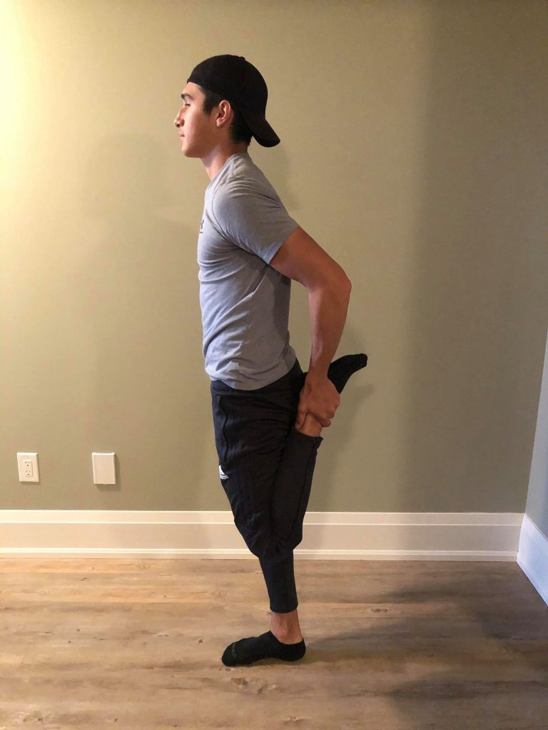 • Pull leg upward toward gluteal muscle (buttocks). Stand as straight as possible, if needed, use the wall to keep balance.