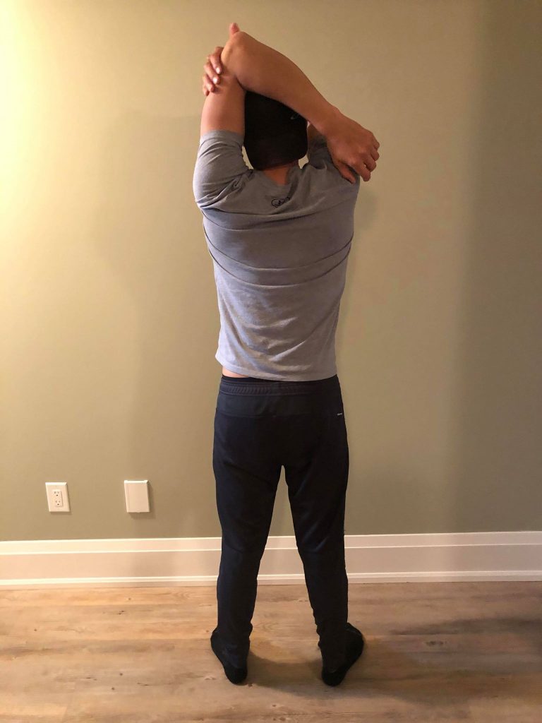 • With your right hand, grasp your left arm just above the elbow and slightly pull your left elbow toward your head as your left hand reaches farther down your back.