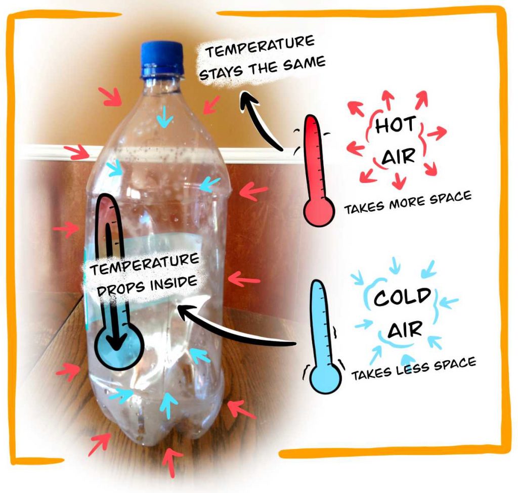 The hot water heated the air inside the bottle. When you poured the hot water out the air inside the bottle cooled down. Since cooler air takes up less space than warmer air, there was extra room in the bottle. To fill that extra space, the sides of the bottle were pushed in by the force of air pressure outside the bottle!1