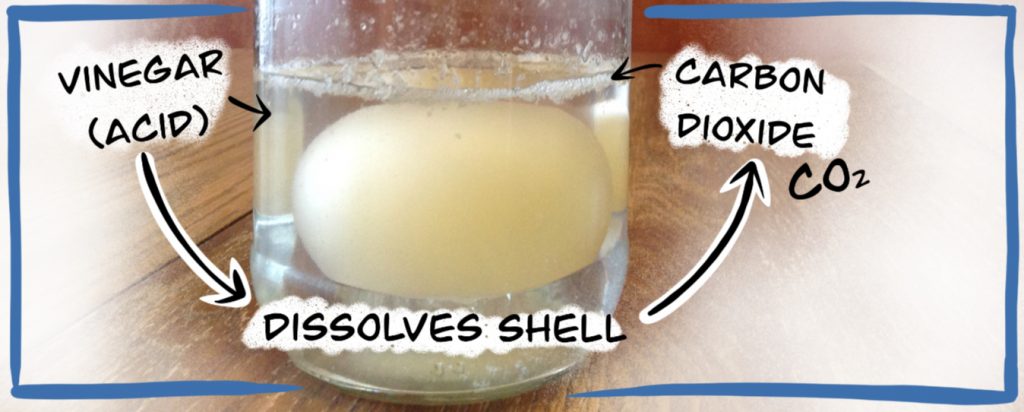 Vinegar is an acid. The bubbles that you see are vinegar breaking down the shell into carbon dioxide. However, the membrane underneath the shell does not dissolve. It becomes rubbery instead.1