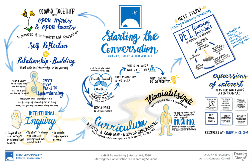 During this session, we started the conversation around the process of self-reflection rooted in three competencies: diversity, equity and inclusion. We discussed how this process and these competencies would add strength to Ilinniatitsiguti, an Inuit-centred development tool. Increasingly, teachers will be asked to use Ilinniatitsiguti to design culturally relevant curriculum for Nunavimmuit learners.