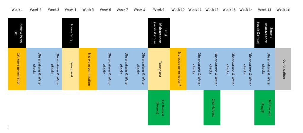 The nutritower project can extend across a term or the entire school year or beyond that if the teacher desires. The following progression starts with the initial set up, continues through to germination and transfer to the tower. A cycle of maintenance, water treatments and observations repeat until the final harvest or continuation into the following term or year.