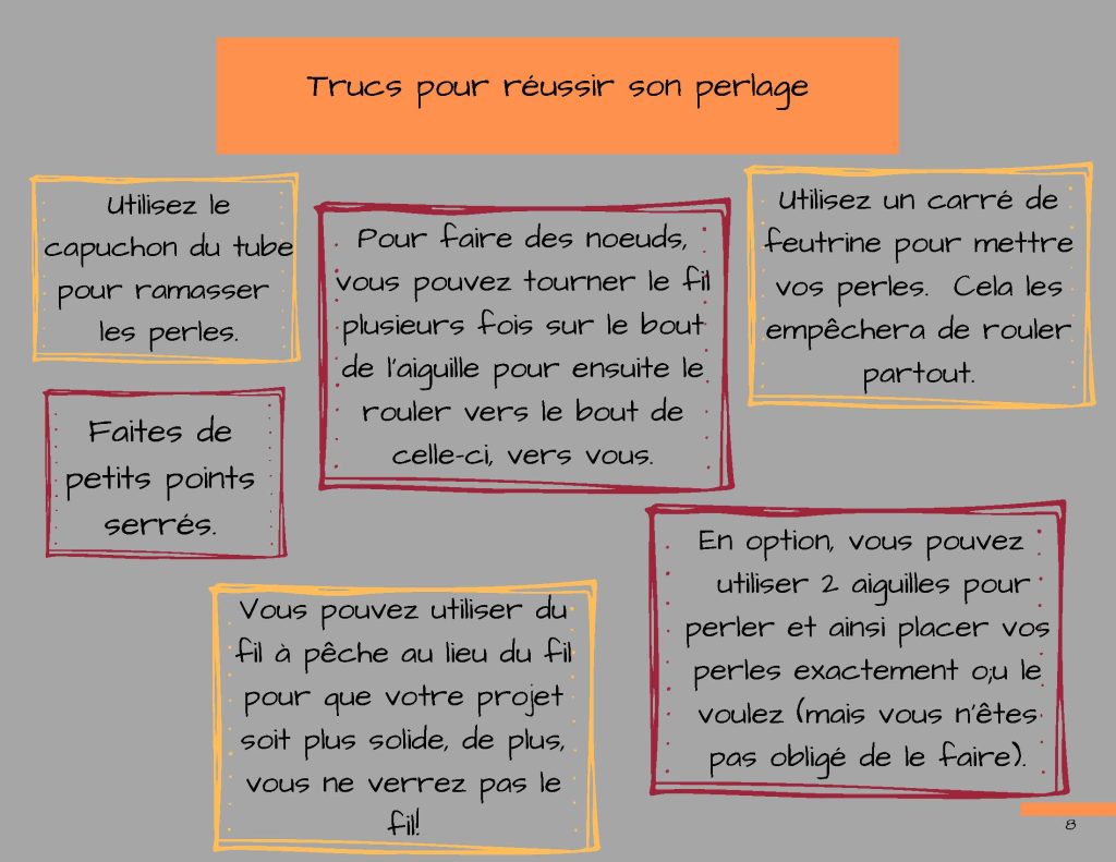 Ce document a été créé pour les enseignants qui souhaitent introduire le perlage auprès de leurs élèves du primaire ou du secondaire. Il comprend un aperçu des outils disponibles et la manière de les utiliser, ainsi qu’une série de conseils pour faciliter l’enseignement.