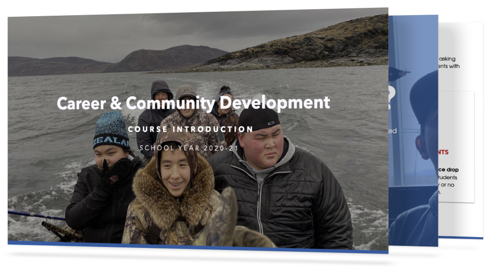 Bienvenue au cours de carrière et développement communautaire (CDC)! Le cours de CDC a été conçu pour éveiller les jeunes Nunavimmiut à leur immense potentiel ainsi que pour les aider à tirer profit de leurs habiletés collectives, de leurs valeurs et intérêts afin donner de l’essor à leur communauté. Ce cours ne suis pas un modèle éducatif traditionnel. Il s’agit plutôt d’un cours qui a été conçu pour aider les élèves du Nunavik à développer des idées pour répondre aux besoins courant et futurs de la région. L’objectif de cette page est de vous fournir une vue d’ensemble sur le cours.