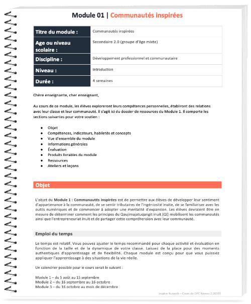 L’objet du Module 1 : Communautés inspirées est de permettre aux élèves de développer leur sentiment d’appartenance à la communauté, de se sentir tributaires de l’ingéniosité inuite, de se familiariser avec les outils numériques et de commencer à adopter une mentalité d’expansion. Les élèves devraient être en mesure de déterminer comment les principes du Qaujimajatuqangit inuit (QI) mobilisent les communautés ainsi que l’entrepreneuriat inuit et de partager cette compréhension avec leur communauté.