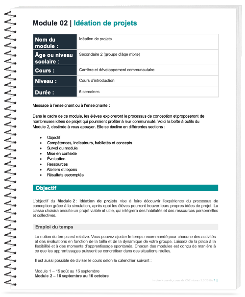 L’objectif du Module 2 : Idéation de projets vise à faire découvrir l’expérience du processus de conception grâce à la simulation, après quoi les élèves pourront trouver leurs propres idées de projet. La classe choisira ensuite un projet viable et utile, qui intégrera des habiletés et des ressources personnelles