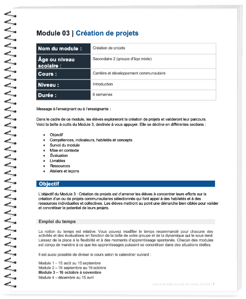 L’objectif du Module 3 : Création de projets est d’amener les élèves à concentrer leurs efforts sur la création d’un ou de projets communautaires sélectionnés qui font appel à des habiletés et à des ressources individuelles et collectives. Les élèves mettront au point une démarche bien ciblée pour valider et concrétiser le potentiel de leurs projets.