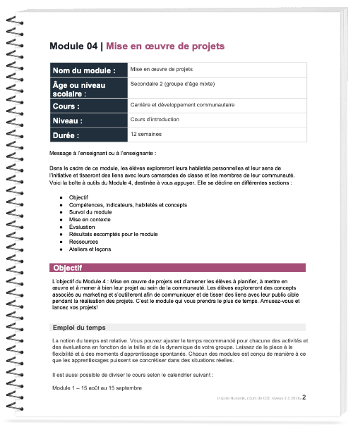 L’objectif du Module 4 : Mise en œuvre de projets est d’amener les élèves à planifier, à mettre en œuvre et à mener à bien leur projet au sein de la communauté. Les élèves exploreront des concepts associés au marketing et s’outilleront afin de communiquer et de tisser des liens avec leur public cible pendant la réalisation des projets. C’est le module qui vous prendra le plus de temps. Amusez-vous et lancez vos projets!
