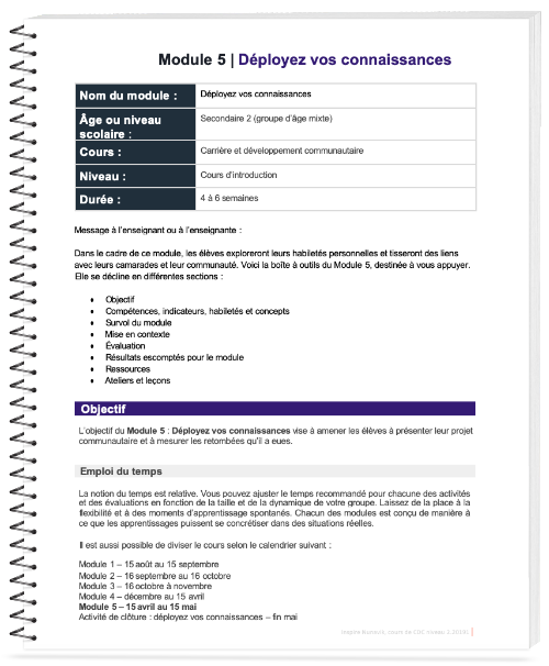 L’objectif du Module 5 : Déployez vos connaissances vise à amener les élèves à présenter leur projet communautaire et à mesurer les retombées qu’il a eues.