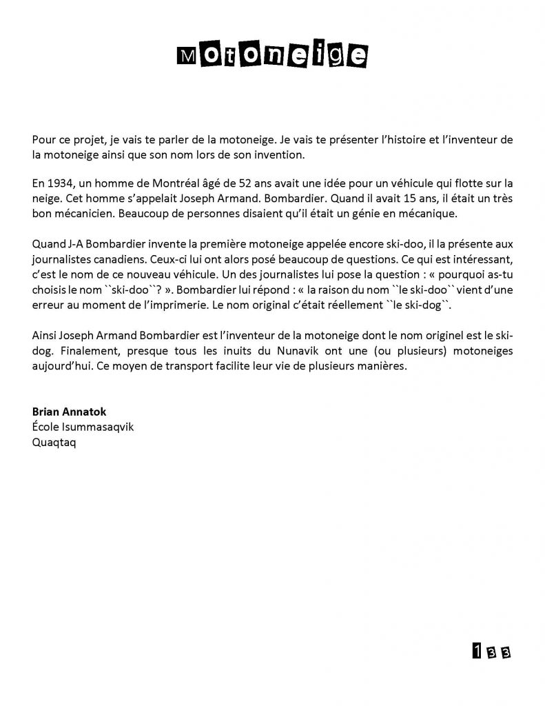 Utilisez les textes des Écrits du Nunavik en classe en les lisant avec vos élèves, en complétant les activités proposées ou en vous inspirant des thèmes pour proposer des situations d’écriture à vos élèves.