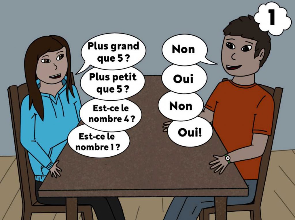 - Pour deviner le nombre, l’enfant peut poser des questions comme: « Le nombre est-il plus grand que..? » ou « Le nombre est-il plus petit que..? »