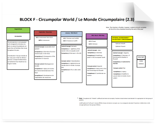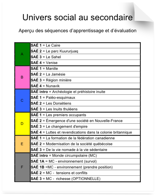 Le programme d’univers social de KI couvre quatre thèmes qui sont organisés en blocs allant de A à F. Les thèmes sont la géographie (A et B), l’archéologie et la préhistoire inuite (C), l’histoire et la citoyenneté, (D et E) et le monde circumpolaire (F). Voici un aperçu des situations d’apprentissage et d’évaluation (SAÉ) pour le programme d’univers social du secondaire. Le programme est organisé selon deux cycles de rotation, un pour les niveaux 1.0, 1.1 et 1.2 du premier cycle et un autre pour les niveaux 2.1 et 2.2 du deuxième cycle. Les SAÉ à couvrir dépendront donc du cycle de vos élèves et de la rotation établie cette année-là par les Services Éducatifs.