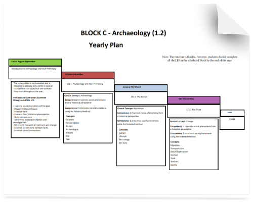 Le guide du programme pour chaque bloc décrit les compétences pertinentes et énumère les critères d’évaluation (également appelé opérations intellectuelles) associés aux compétences. En plus d’utiliser les opérations pour évaluer les compétences, elles sont utilisées pour créer du matériel pour les SAÉ. C’est pourquoi, durant un bloc, la SAÉ touche toutes les opérations intellectuelles attribuées à ce bloc. Voici quelques exemples d’opérations intellectuelles associées aux deux compétences du bloc C, Archéologie et Préhistoire inuit : examiner des phénomènes sociaux, établir des faits, caractériser un phénomène historique et faire des comparaisons.